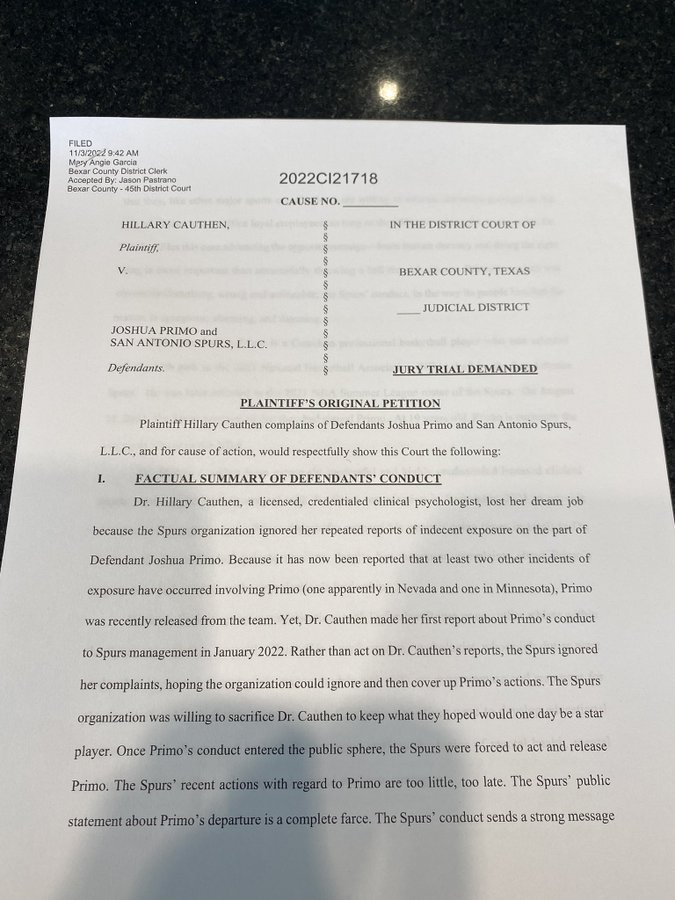 18 hours agoPsychologist Hillary Cauthen has made an accusation against the 19-year-old NBA player and will speak out on Thursday about him in a press conference according to TMZ. Hillary Cauthen filed a lawsuit in Bexar County Texas against Primo and the San Antonio Spursa lawsuit in which she. Former San Antonio Spurs consulting psychologist Dr.